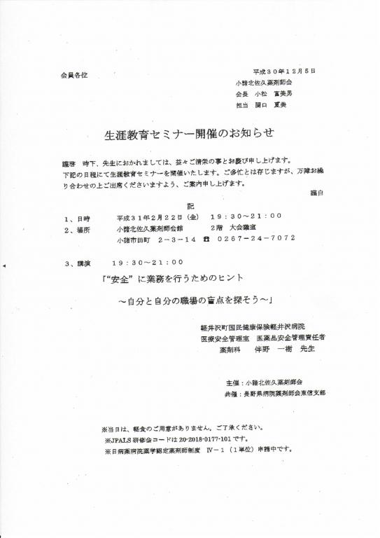 2018年12月14日 生涯教育セミナー(小諸北佐久薬剤師会) ウェブマスター 開催日 :2019年02月22日(金) 開催時間:19:30 開催場所:小諸北佐久薬剤師会館 2階大会議室 講 演 「”安全”に業務を行うためのヒント 〜自分と自分の職場の盲点を探そう〜」 軽井沢町国民健康保険軽井沢病院 医療安全管理室 医薬品安全管理責任者 薬剤科 伴野 一樹先生