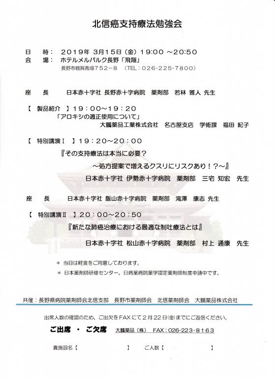 2019年02月01日 北信癌支持療法勉強会 事務局 開催日 :2019年03月15日(金) 開催時間:19:00~20:50 開催場所:ホテルメルパルク長野3階 飛翔 座長:日本赤十字社飯山赤十字病院 薬剤部 滝澤 康志先生 【特別講演1】(19:20~20:00) 演者:日本赤十字社伊勢赤十字病院 薬剤部 三宅 知宏先生 「その支持療法は本当に必要? ~処方提案で増えるクスリにリスクあり!?~」 【特別講演2】(20:00~20:50) 演者:日本赤十字社松山赤十字病院 薬剤部 村上 通康先生 「新たな肺癌治療における最適な制吐療法とは」
