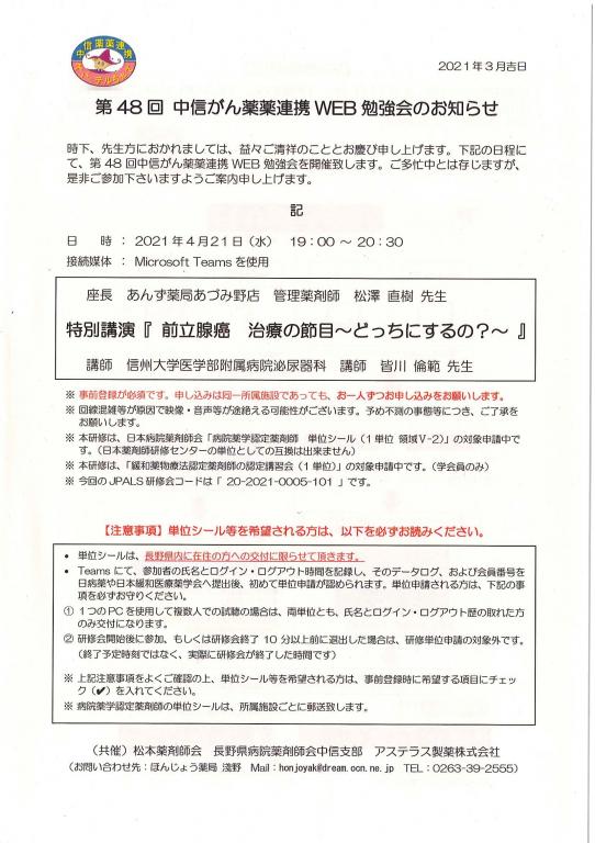 第48回中信がん薬薬連携WEB勉強会【WEB研修】