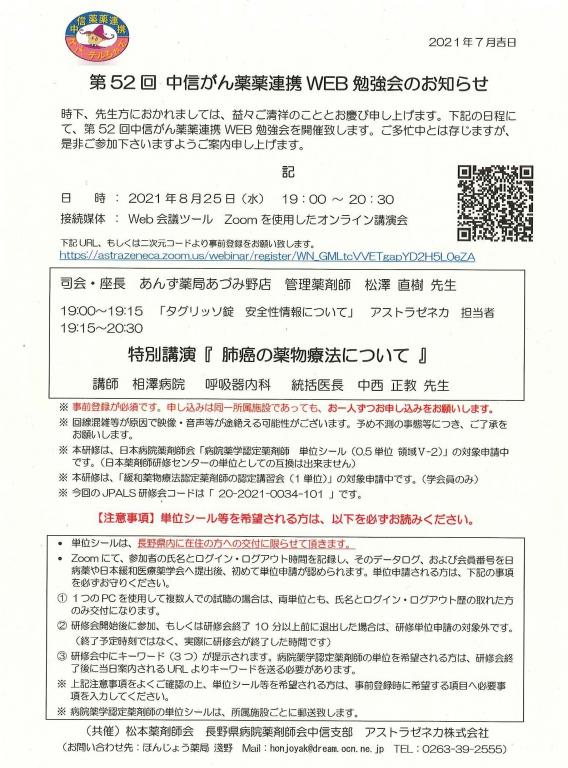 第52回中信がん薬薬連携WEB勉強会【WEB研修】