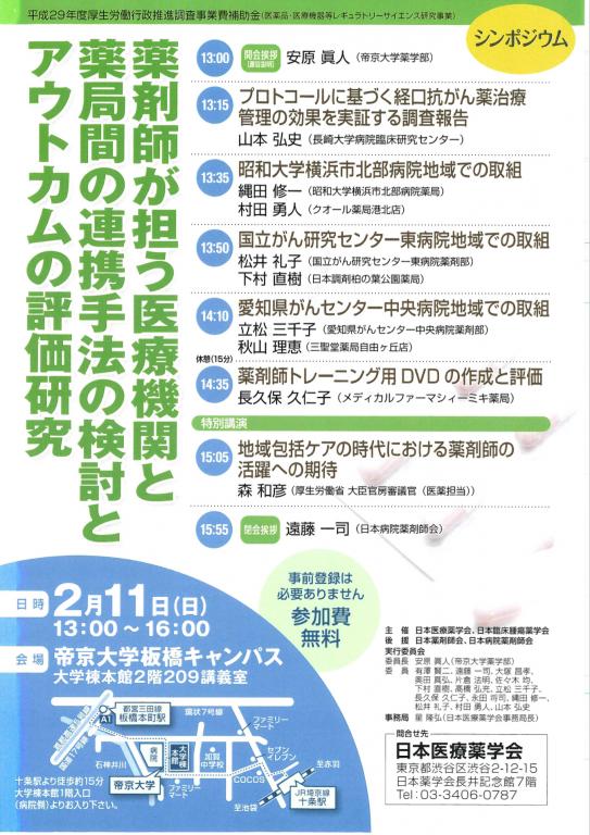 平成29年度厚生労働行政推進調剤事業補助金(医薬品・医薬品機器等レギュラトリーサイエンス政策研究事業)の事業としてシンポジウム「薬剤師が担う医療機関と薬局間の連携手法の検討とアウトカムの評価研究」を開催することとなりました。