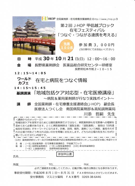 2018年08月03日 第2回 J-HOP 甲信越ブロック 在宅フェスティバル 「つなぐ・つながる連携を考える」 ウェブマスター 開催日 :2018年10月21日(日) 開催時間:12:00 開催場所:⻑野県薬剤師会 医薬品総合研究センター研修室