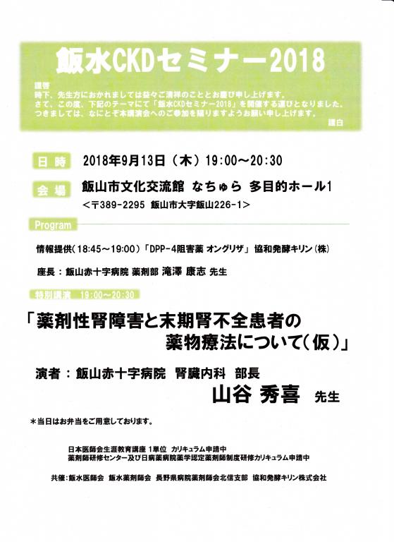2018年08月06日 飯水CKDセミナー2018(飯水医師会、飯水薬剤師会、長野県病院薬剤師会北信支部) 事務局 開催日 :2018年09月13日(木) 開催時間:19:00~20:30 開催場所:飯山市文化交流館 なちゅら 多目的ホール1 座長:飯山赤十字病院 薬剤部 滝澤 康志先生 演者:飯山赤十字病院 腎臓内科 部長 山谷 秀喜先生 「薬剤性腎障害と末期腎不全患者の薬物療法について(仮)」