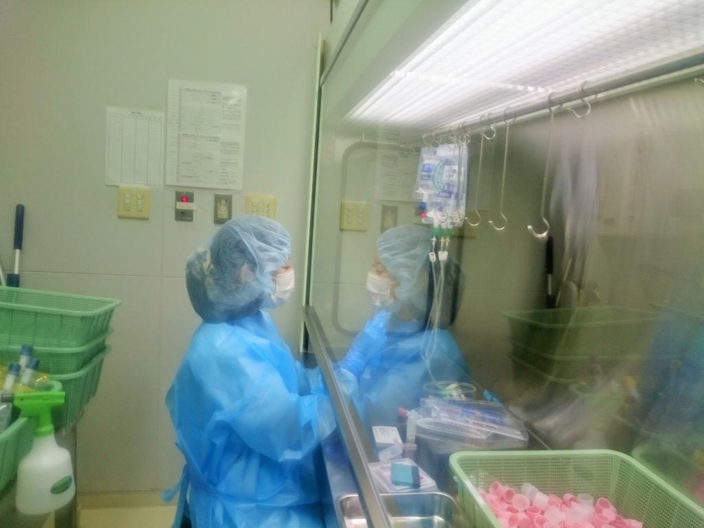 入社後、3ヶ月はしっかり薬剤部内(調剤・製剤・DI業務)の仕事を覚え、身に付けた後、病棟へ配属され各病棟の先輩薬剤師の指導のもと、病棟業務につき始めました。正確さと迅速さ、幅広い知識を求められる薬剤師業務は多岐に渡り、毎日様々な業務を行います。とある日は、午前中に抗がん剤の調製を化学療法・ホルモン療法を専門に行う施設、通院治療センターにて行い、その後、病棟へ行き、入院患者の処方の確認・他の医療スタッフからの相談に対応等々、午後は病棟にて退院準備や入院患者へ服薬指導等を行い、その後、薬剤部へ戻り、調剤を行う。このように多くの業務を行い、たくさんの患者さんに関わる日もありました。