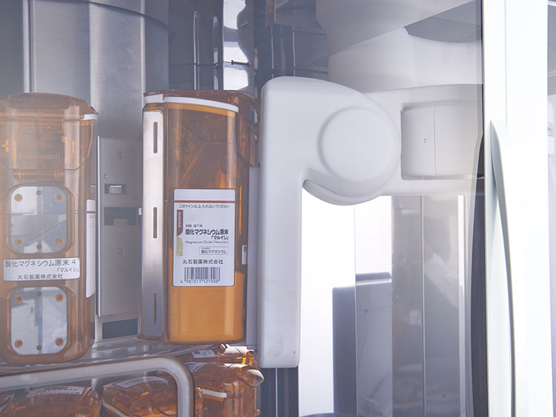 散薬カセット(最大30種類)を工業用ロボットのアームで取り出し最大6種類の薬品を秤量することができます。小児科のような少量の薬品もある程度パラメーター設定(当院では全量1.2g以上)により大部分のオーダーが調剤可能となっています。また洗い用カセット(重曹等)もあり必要に応じて運用が可能となっています。