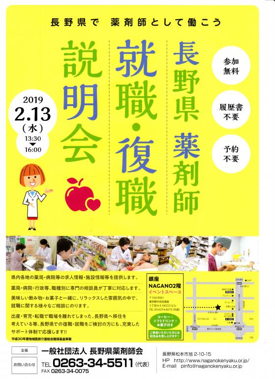現在県外にお住まいで、今後長野県での復職をお考えの薬剤師の方、長野県へのI・Uターンを希望される薬剤師・薬学生の方を対象に、銀座NAGANOで復職・就職説明会を開催します。当日は、長野県内の病院・薬局等の求人情報をご覧いただけるほか、担当者による個別相談を行います。長野県での復職・就職に関することは、何でもお気軽にご相談ください。