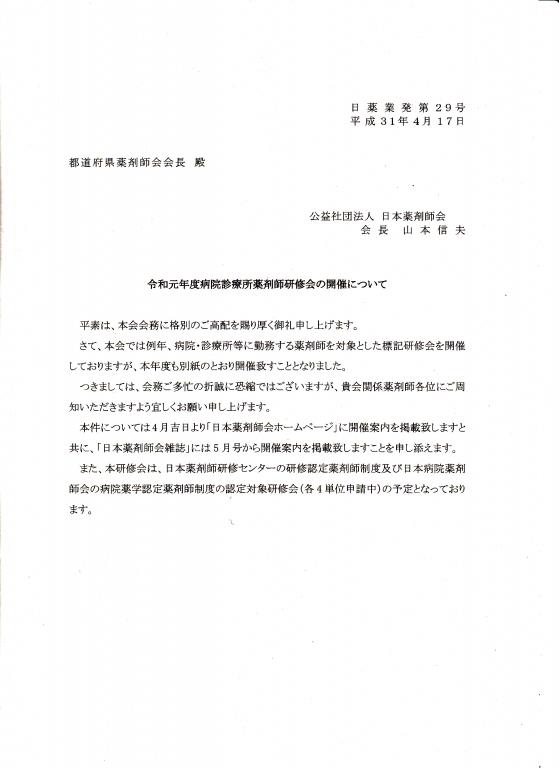 令和元年度日本薬剤師会 病院診療所薬剤師研修会の開催について
