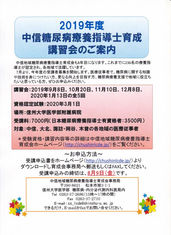 2019年度 中信糖尿病療養指導士育成講習会のご案内