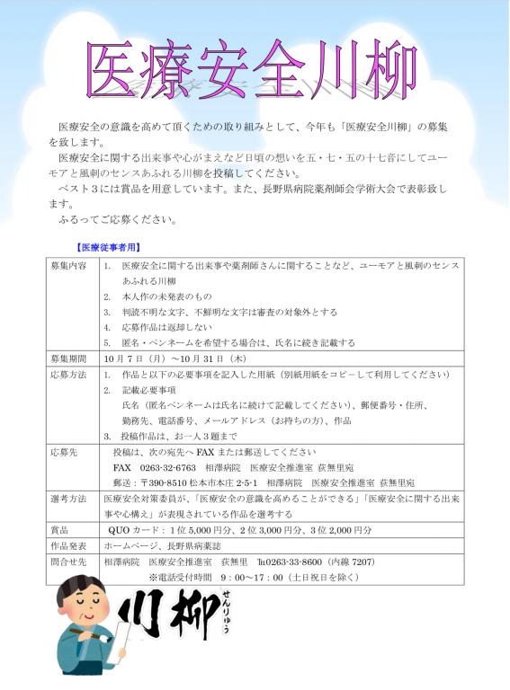 医療安全の意識を高めて頂くための取り組みとして、今年も「医療安全川柳」の募集を致します。