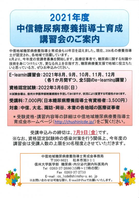 2021年度 中信糖尿病療養指導士育成講習会のご案内