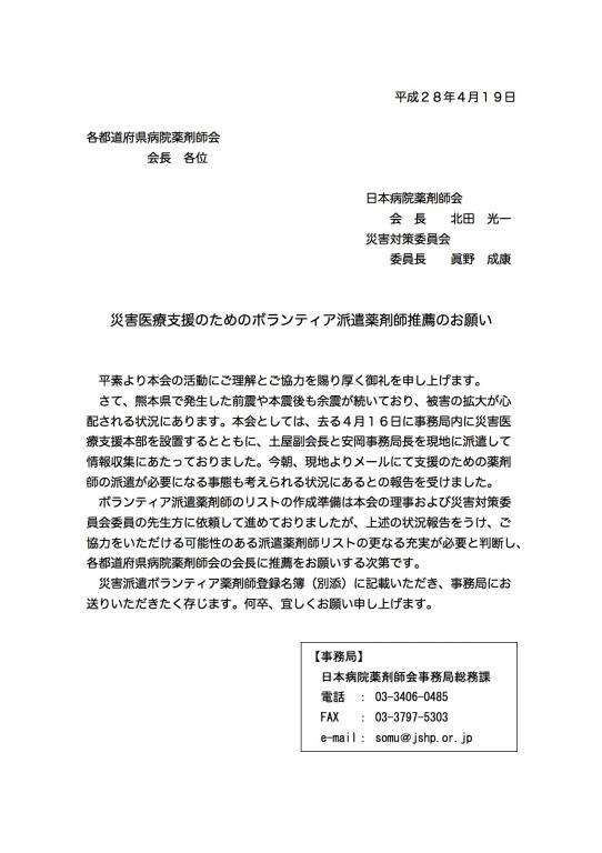 今月14日に発生した熊本地震におきまして日本病院薬剤師会より災害医療支援のためのボランディア派遣の依頼がきており