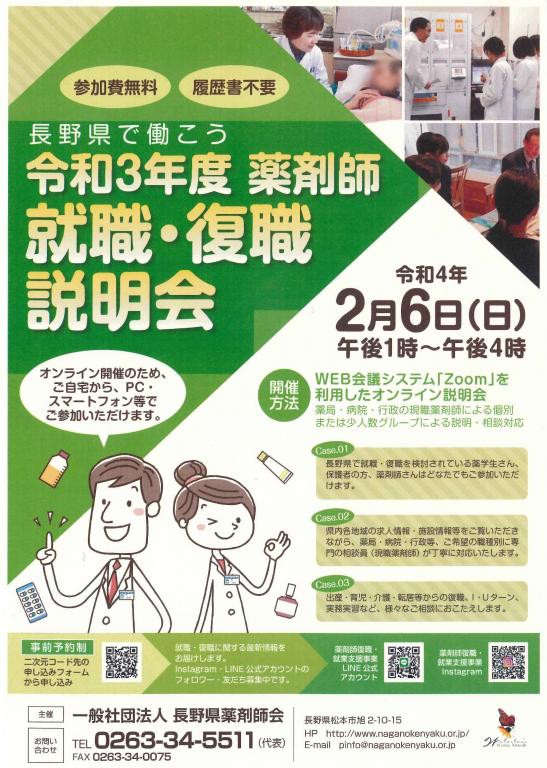 令和3年度薬剤師就職・復職説明会及び長野県内で、子育て・