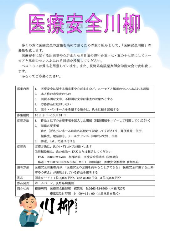 募集内容:1. 医療安全に関する出来事や心がまえなど、ユーモアと風刺のセンスあふれる川柳