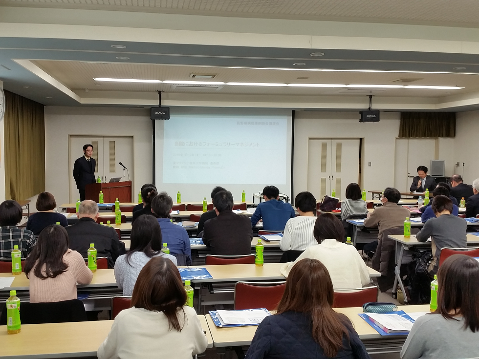平成31年1月12日(土)に長野県薬剤師会医薬品総合研究センターにおいて長野県病院薬剤師会講演会が開催されました。特別講演として聖マリアンナ医科大学病院薬剤部の前田幹広先生をお招きして「 当院におけるフォーミュラリーマネジメント 」と題してご講演いただきました。年始の連休初日にも関わらず47名の先生方に参加いただき、フォーミュラリーの基本から実践まで幅広く学ぶことができました。